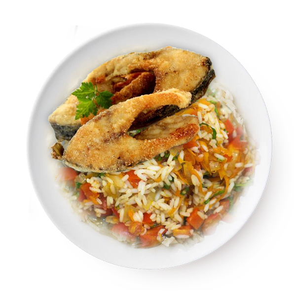 Помидоры, болгарский перец, пекинская капуста, огурцы, жаренная рыба